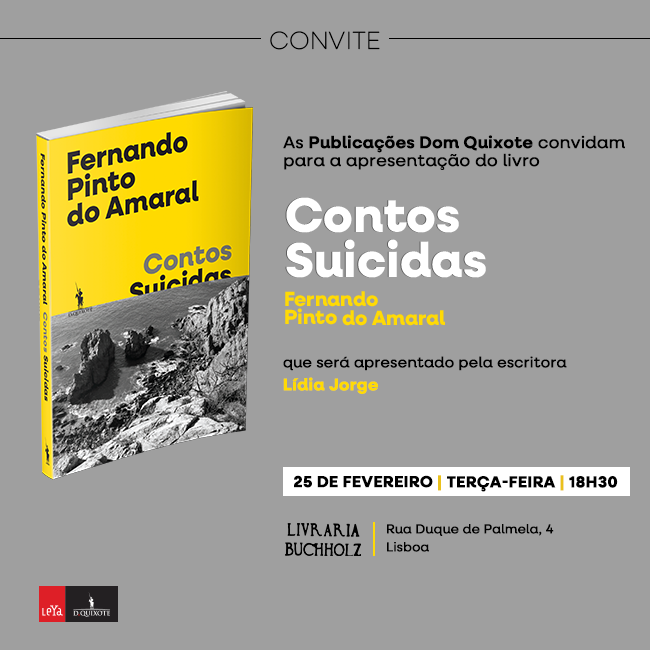 Sessão de apresentação do livro Contos Suicidas (Dom Quixote), de Fernando Pinto do Amaral, apresentado por Lídia Jorge, às 18h30, na Livraria Buchholz, em Lisboa.