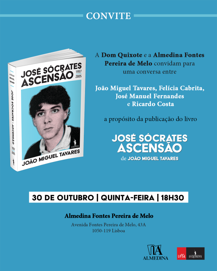 José Sócrates - Ascensão (1957-2005), do jornalista e comentador João Miguel Tavares é apresentado na quinta-feira, 30 de outubro, às 18h30, na Almedina Fontes Pereira de Melo, numa conversa com Felícia Cabrita, José Manuel Fernandes e Ricardo Costa. Resultado de quase dez anos de investigação, a biografia analisa o percurso de José Sócrates, desde o nascimento até à sua transformação no homem mais poderoso do país, quando conquistou a primeira maioria absoluta para o Partido Socialista